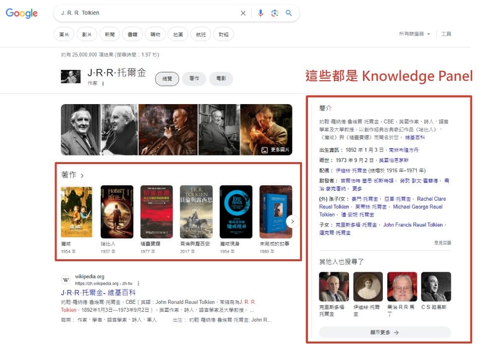 Google Knowledge Graph(知識圖譜)是一個結構化的資料庫,用來整理人物、地點、品牌、組織等「實體」(Entity)以及它們彼此之間的關聯性,它讓 Google 不只是看懂網頁上的文字,而是能理解每個名詞背後代表的是什麼意思,以及它與其他事物之間的關係。透過這套系統,Google 可以將相關資訊快速整合,並以「Knowledge Panel(知識面板)」的形式直接呈現在搜尋結果頁上。舉例來說,當你搜尋一個知名品牌、人物或地點時,畫面右側或上方會出現一個統整式資訊卡片,此卡片就是來自知識圖譜的應用成果。