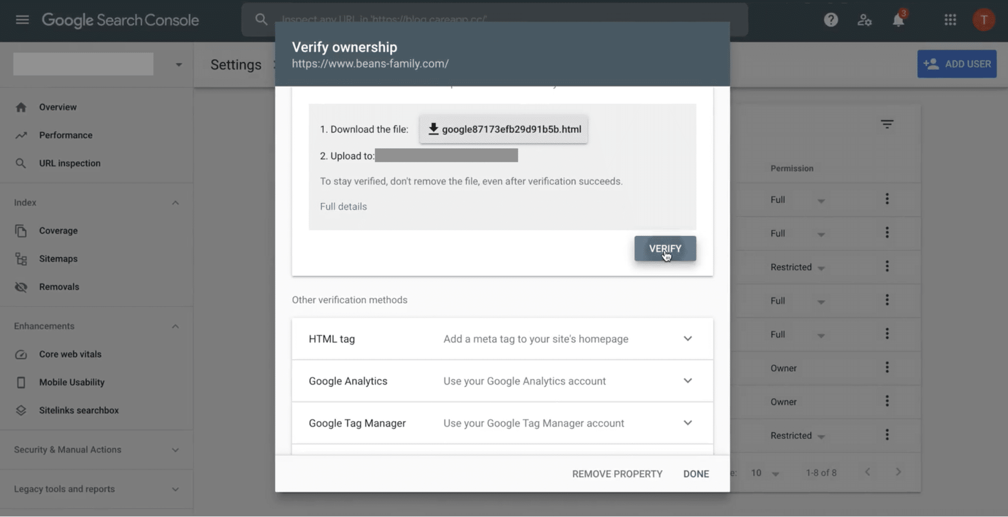 步驟3:最後回到Google Sreach Console頁面,點擊VERIFT按鈕就可順利完成驗證。