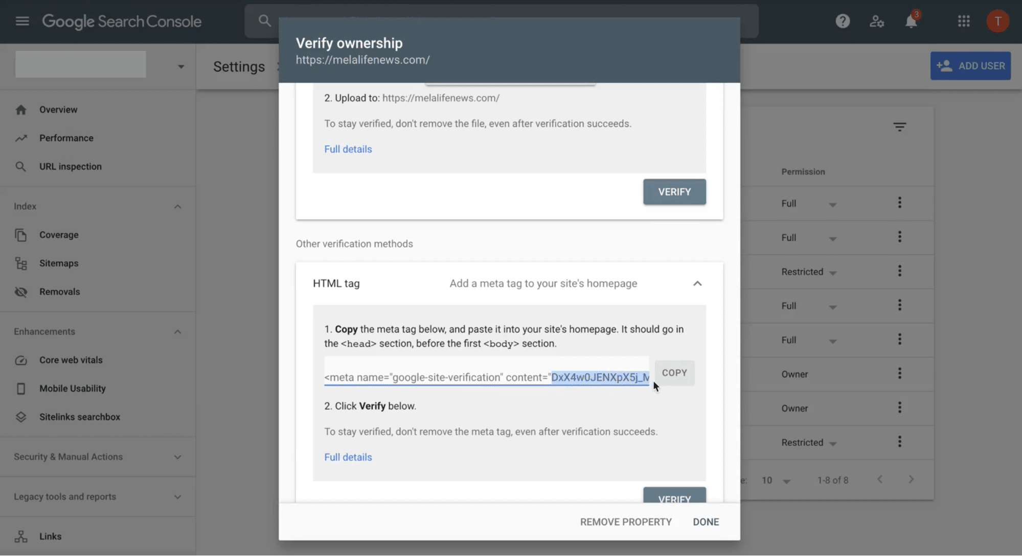 步驟1:從Google Sreach Console驗證介面下方的其他驗證方法中,點選HTML tag欄位,並複製content語法之後的驗證碼。