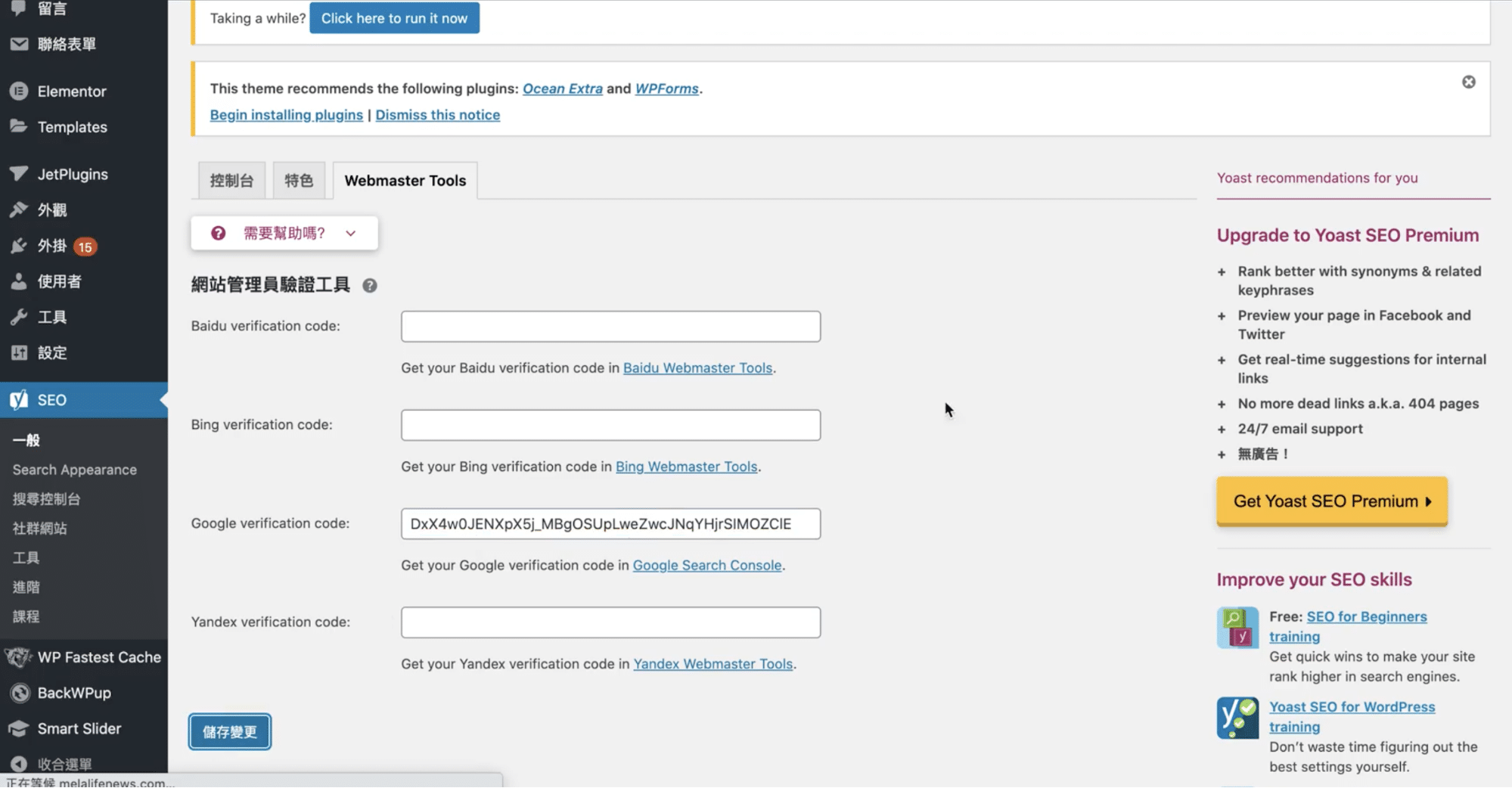 步驟2:將複製的驗證碼貼到Yoast SEO【Webmaster Tool】頁面中的Google verification code欄位,並按下變更儲存。
