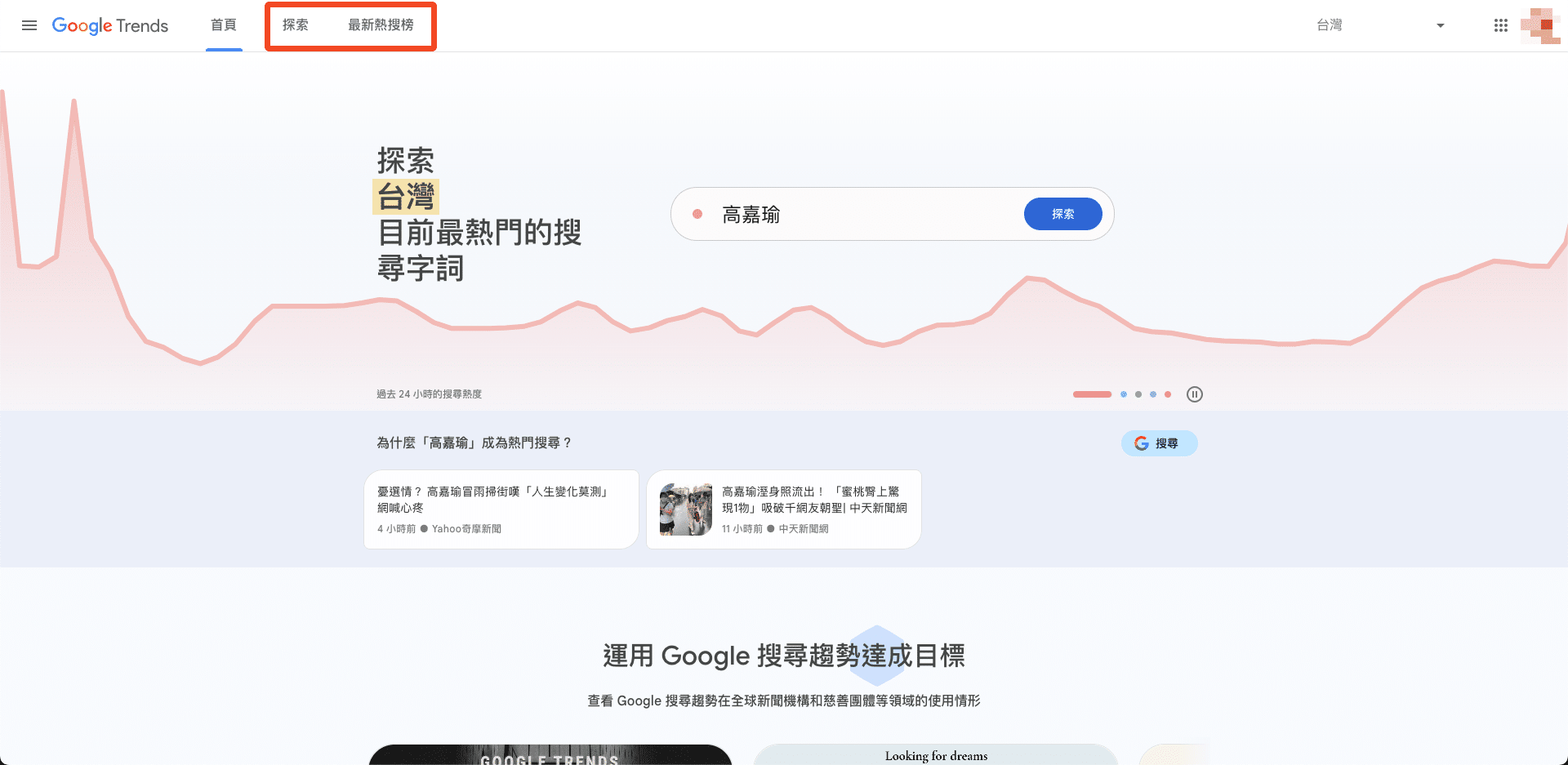從 Google Trend 的介面中可以看到「探索」以及「最新熱搜榜」兩大區塊,分別用於歷史搜尋趨勢紀錄查詢以及了解目前在 Google 搜尋引擎上發生的即時熱門搜尋關鍵字。