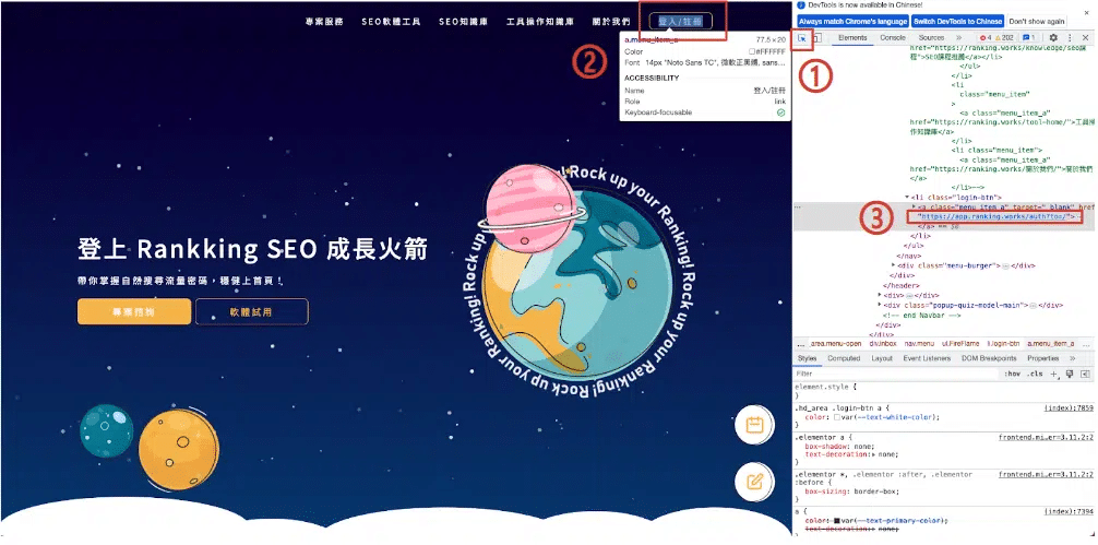 如果不知道按鈕對應的連結為何,可以在網頁內按滑鼠右鍵,點選檢視後網頁程式碼會出現在右側資訊欄,點選資訊欄左上角的游標圖示,再將滑鼠移動到按鈕上,就可以從資訊欄中找到對應的連結了!