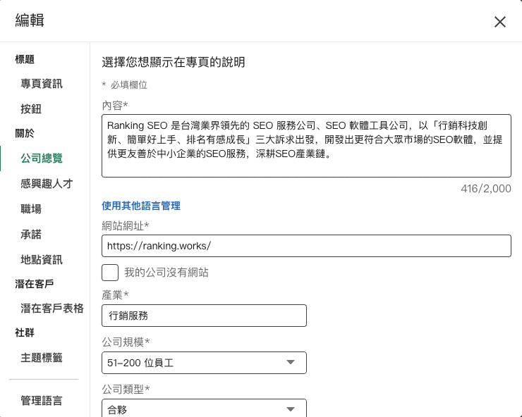 這些輸入除了會成為頁面中顯示的內容文案以外,公司名稱的內容會被設定為專頁的頁面標題 (meta title),而公司介紹會被設定為頁面敘述 (meta description),因此如何撰寫一個良好的公司介紹是相當重要的一件事。除此之外,值得一提的是 LinkedIn 會針對不同的語系有不同的子網域,例如台灣版本的 LinkedIn 頁面網址為 tw.linkedin.com、中國版本的為 cn.linkedin.com,預設英文版本為 linkedin.com。因此你的專頁一創立後其實是具備有多國語系 SEO 操作的基本條件,你可以使用 LinkedIn 提供的多語言版本功能來管理瀏覽不同國家版本的內容。