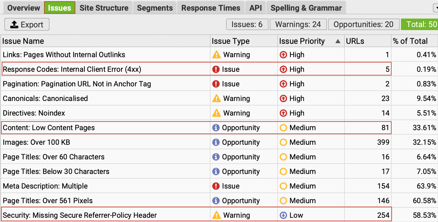 Screaming Frog 爬蟲檢測完網站後,會將偵測到的網站問題羅列出來,而 Issues 議題欄位的功能則是標示這些問題的重要程度,幫助使用者判斷哪些問題應該被優優先解決。