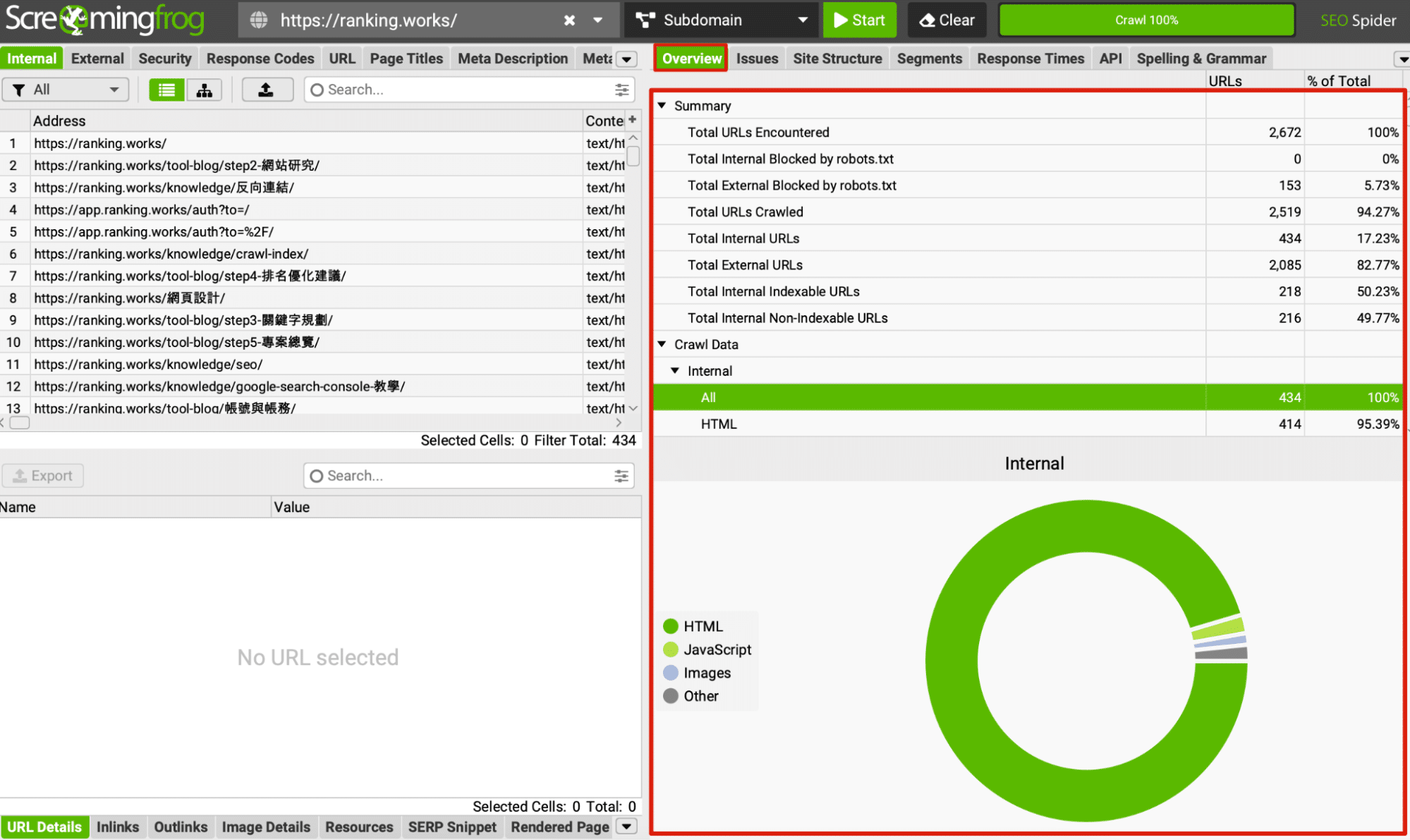 在 Overview 網站總覽的欄位可以看到網站所有頁面 URL 的檢索結果,並且其中也包含網站的頁面類型組成,以 Rankking 網站舉例,從下圖可以發現網站大多是由 HTML 以及少部分的JavaScript、CSS 與圖片組成。