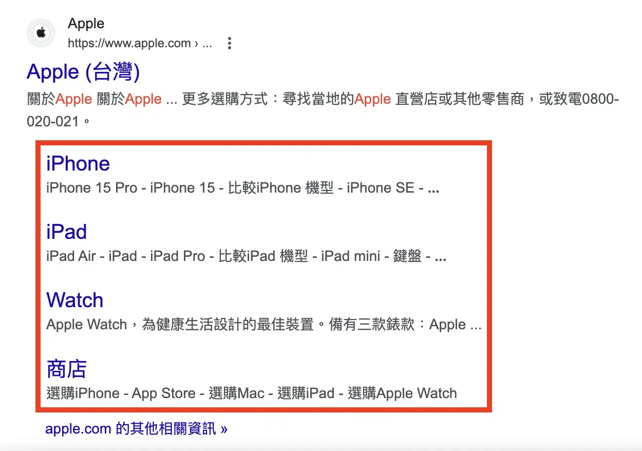這種 Sitelinks 會顯示在「品牌關鍵字」的搜尋結果上,特別是在搜尋結果排名第一的位置,以在 Google 上搜尋「Apple」為例,可以看到在搜尋引擎結果首頁上,除了會出現品牌官網連結以外,底下還會出現一些像是 iPhone、iPad、Watch、商店等相關資訊頁面,這些額外的頁面連結即是所謂品牌網站下的 Sitelinks。