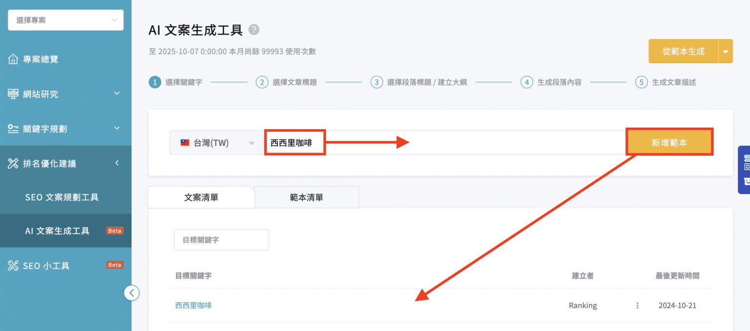 接著,在下方的文案儲存清單看到生成完的文案儲存清單,點選目標關鍵字進入編輯介面。