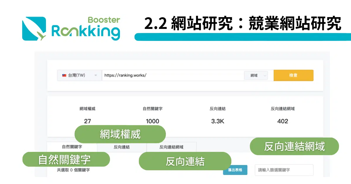 在結果頁最上方區塊會呈現:「網域權威」、「自然關鍵字」、「反向連結」與「反向連結網域」,我們可以根據這些數值,進行初步評估。