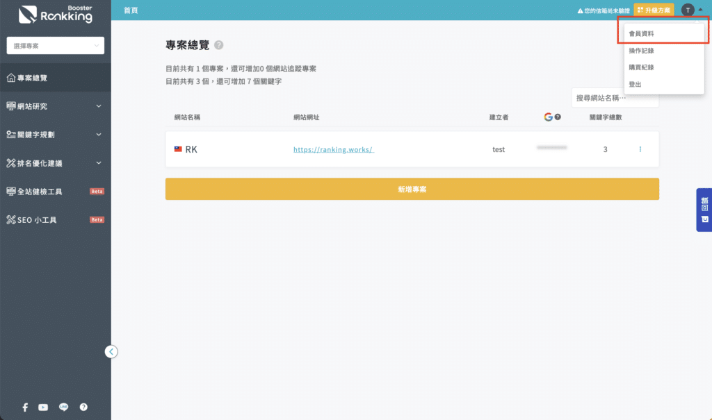點選右上角的灰色圖像,點擊下拉選單中的「會員資料」