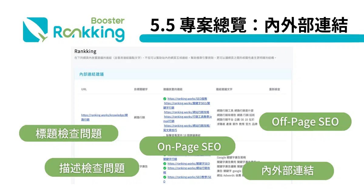 在 Rankking SEO 工具「專案總覽」中的「內外部連結」功能,可獲得佈局網站連結的建議。
