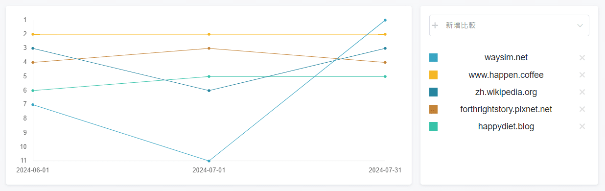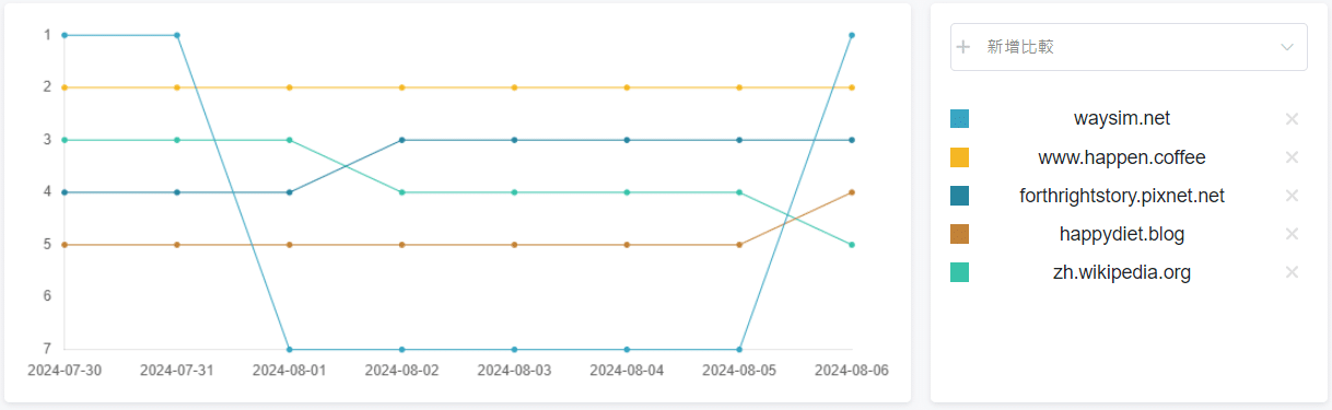 在這個區塊,預設會顯示篩選日期內,最近一次有排名資料前五名網站的排名變化,如需查看其他網站的排名變化,可以點選「新增比較」欄位進行選取,可以選取的網站為篩選日期區間中有進入前 30 名的網站,最多可以新增至 10 個比較網站。