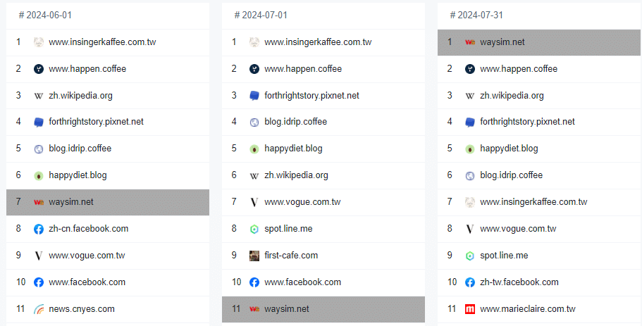 從折線圖可以查看是否有競業對手出現,從圖片中可發現,棕色線的網站在「2023/07/06」之後排名顯著提升。這時我們可以點選網站網址,查看對手的網站是否也有操作 SEO 內容。